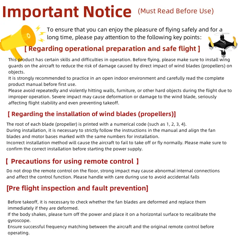 - Install wing guards before flight and practice in open areas.